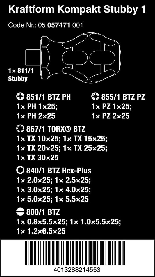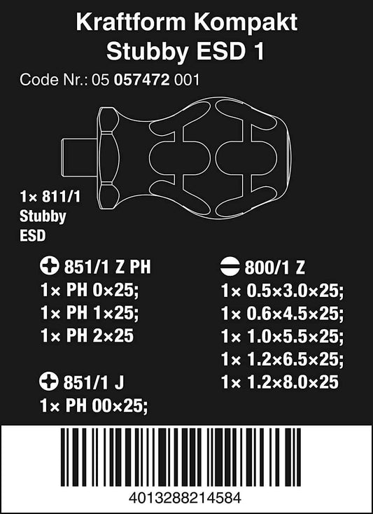 Set of 9 25mm bits with Wera Kraftform Kompakt Stubby ESD bit holder 1 ref.057472