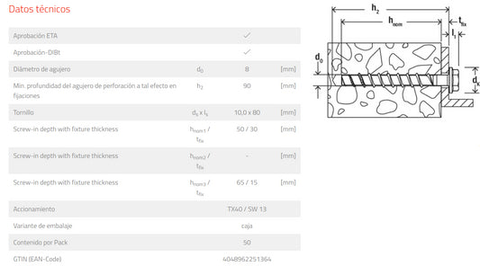 Caja 4 uds tornillo de hormigon UltraCut FBS II 8 x 80 30/15 US TX Fischer