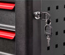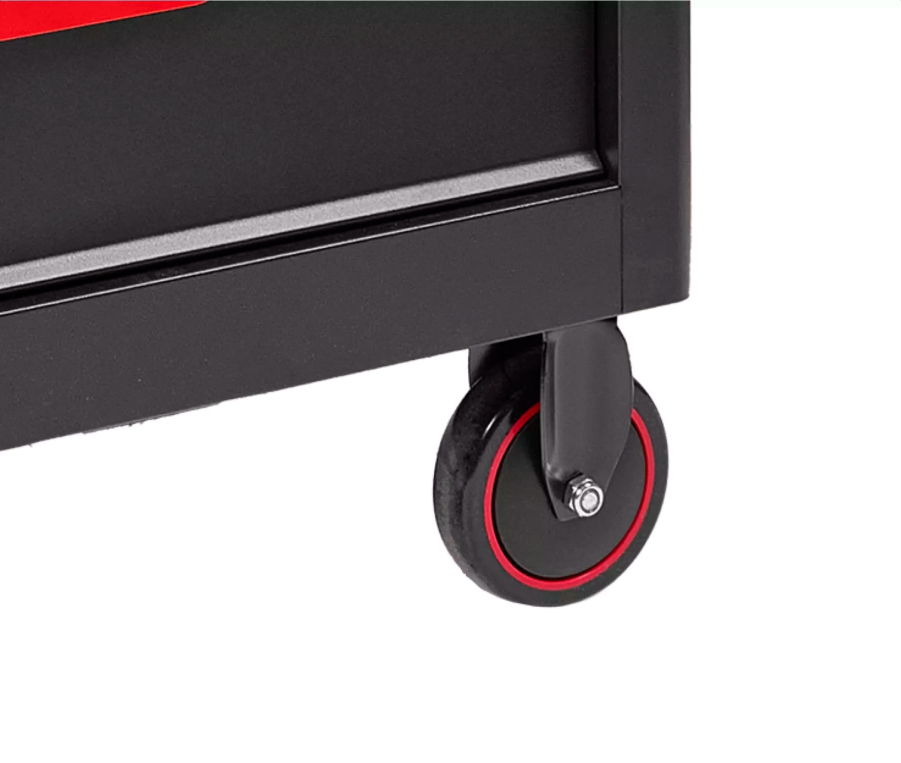 Carro de almacenamiento robusto y móvil, ideal para organizar herramientas y accesorios en talleres domésticos o profesionales. Presentado sin herramientas, ofrece una estructura sólida en color negro con detalles rojos, con seis cajones para máxima versatilidad.