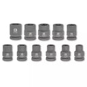 • 11 vasos hexagonales de impacto de 40 mm de longitud, fabricados en acero al cromo-molibdeno (CrMo) fosfatado con manganeso, lo que proporciona una resistencia superior al desgaste y a los altos pares de apriete. Los tamaños de los vasos son: