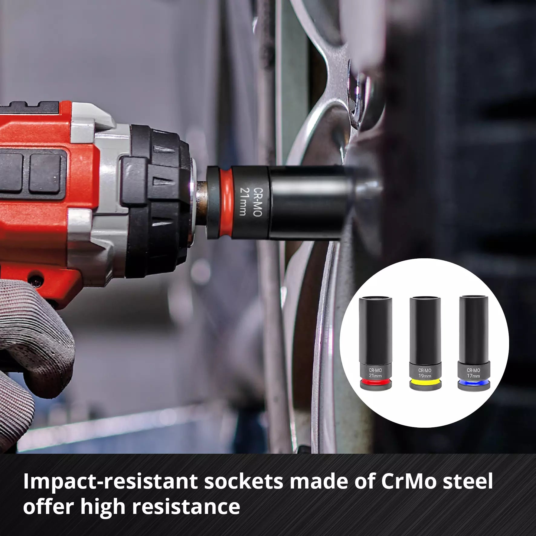 The Einhell 5-piece impact socket set (model 49109273) is a set designed to make wheel changing easier on vehicles, especially those with sensitive alloy wheels.