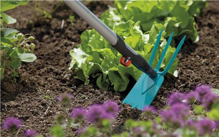 The GARDENA combisystem hoe has a working width of 9 cm and is perfect for caring for the garden while respecting rows of plants and closely spaced flower beds. Hoeing, weeding, aerating, edging or leveling: everything is possible with its straight shovel with teeth on one side and the three points on the other. The large blade with improved contour penetrates the ground more easily. The hoe is suitable for all GARDENA combisystem handles; GARDENA recommends a handle length of 130 or 150 cm, depending on body height.