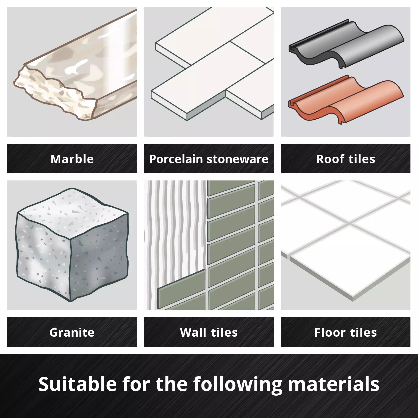 • Designed to drill materials such as porcelain stoneware , marble , granite , tiles and wall and floor tiles .