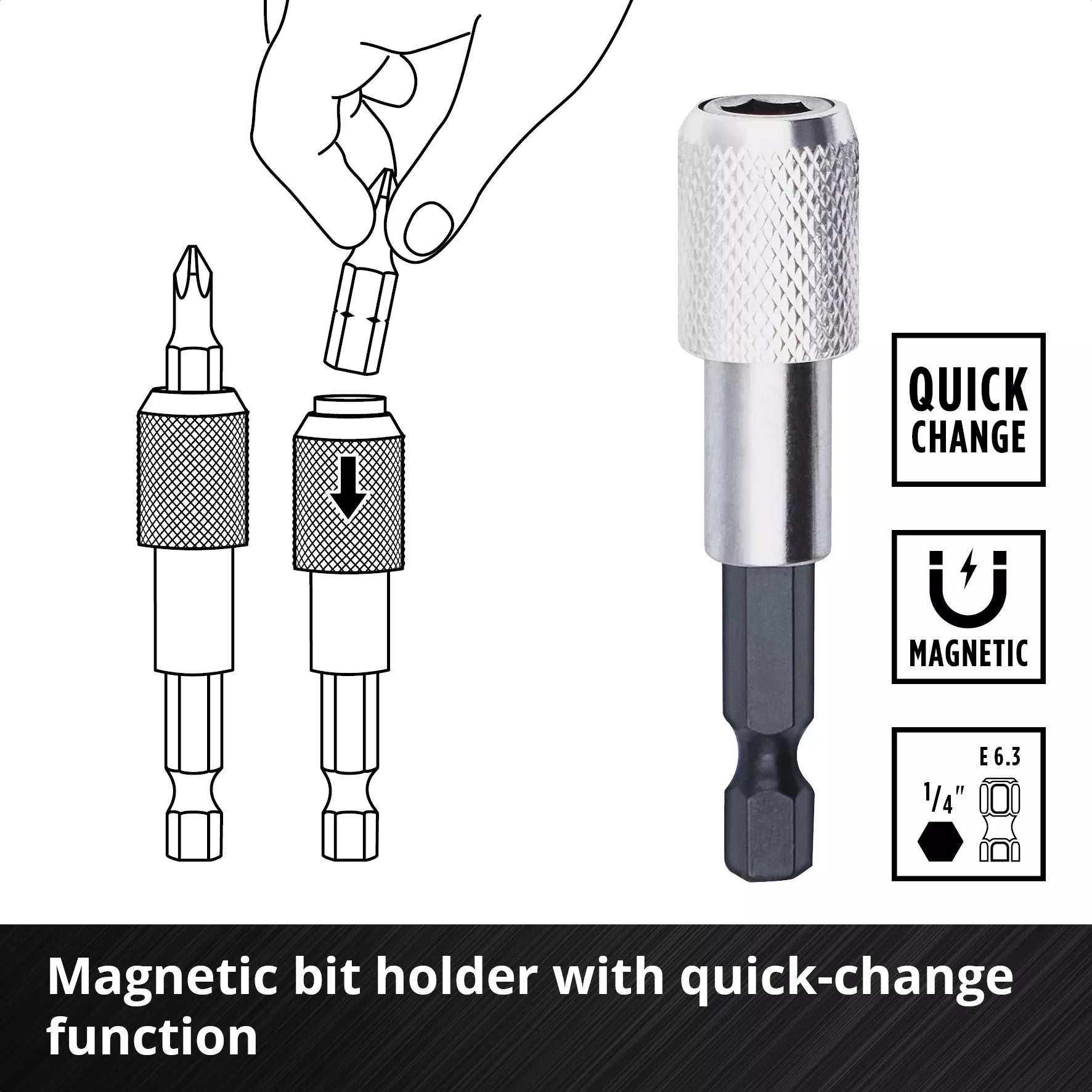 - 1 x 60mm quick-change bit holder , made of carbon steel with E 6.3 shank and a powerful magnet for a firm hold and quick bit changes.