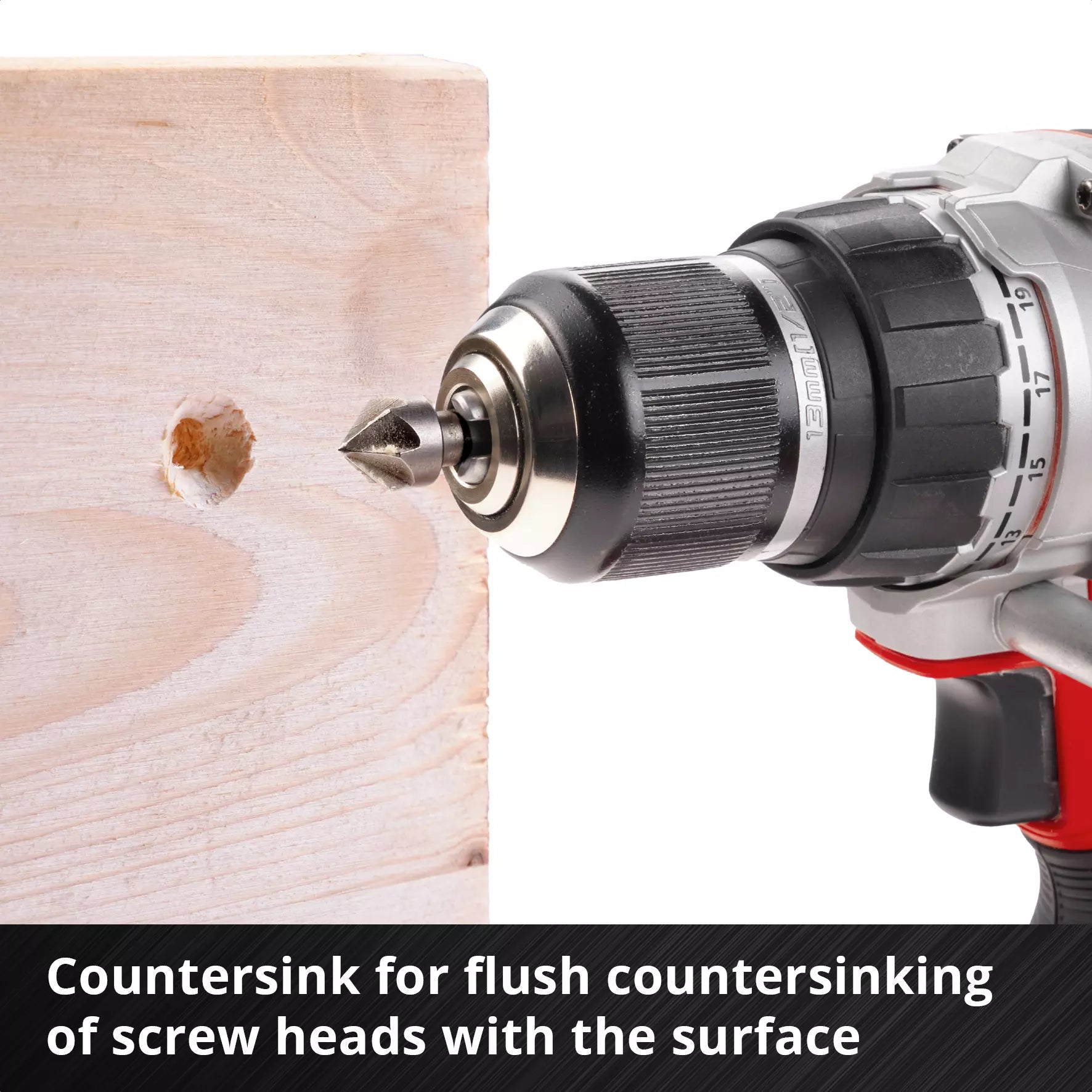 - 1 x 12mm countersink with six cutting edges and E 6.3 shank, ideal for countersinking screw heads flush with the surface.