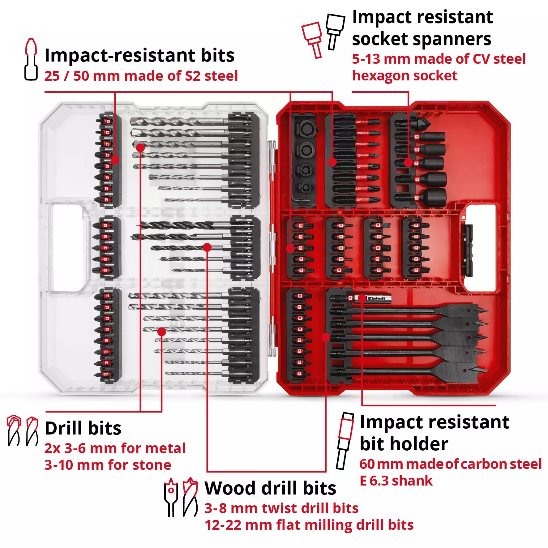 • 8 x 50mm bits with E 6.3 shank:
